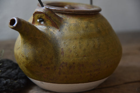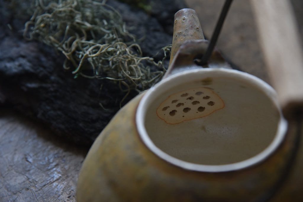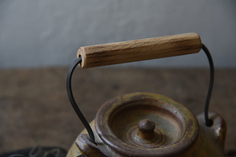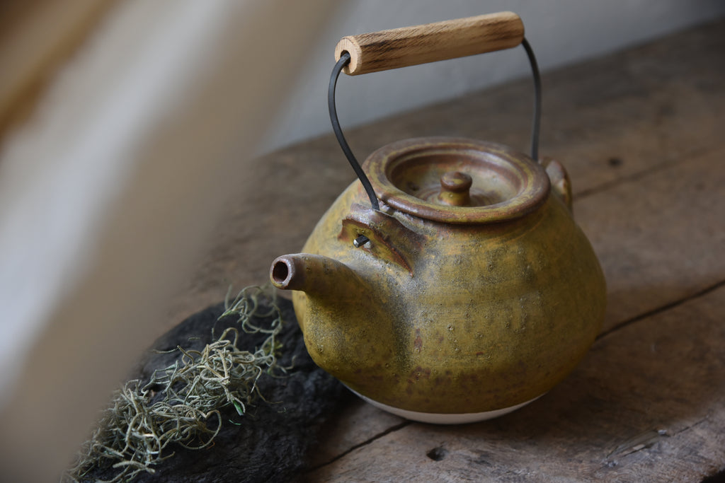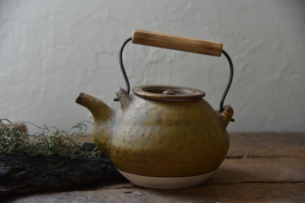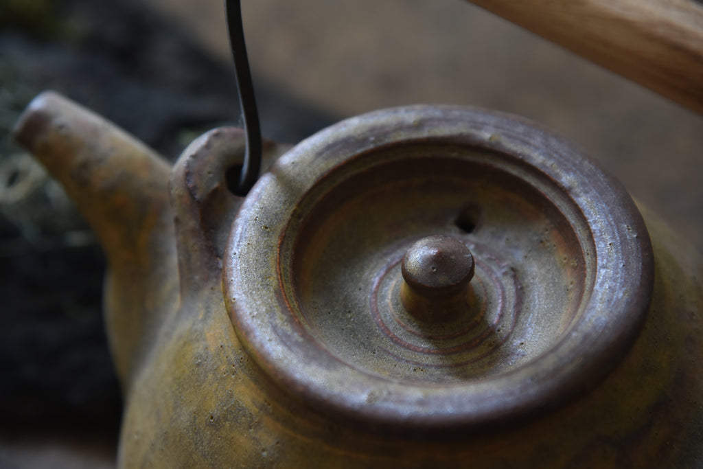 這款煮水壺釉色活潑而富有變化,壺身線條樸拙富有手感,在茶席上相當好搭配。