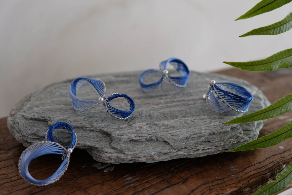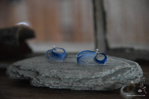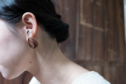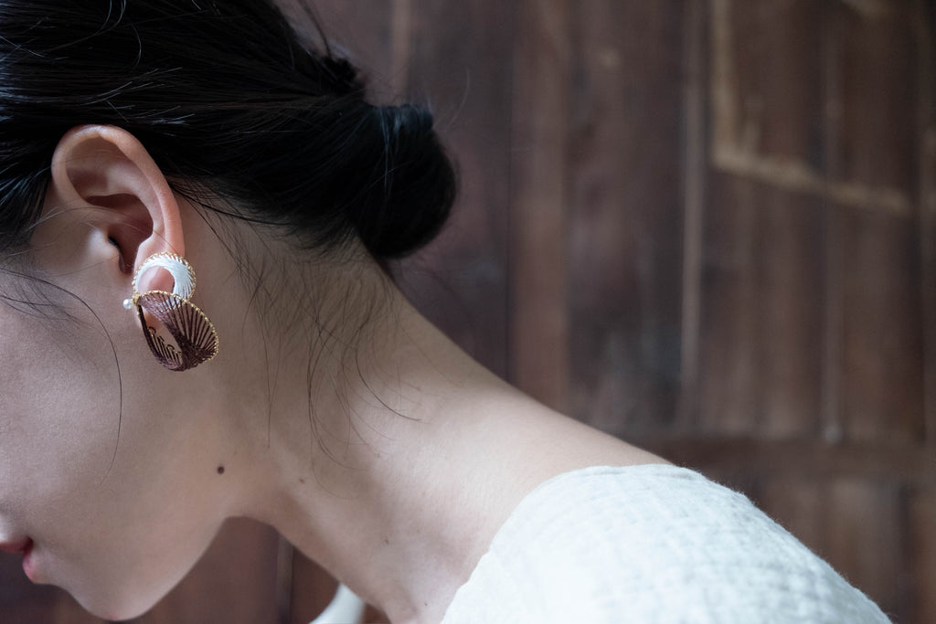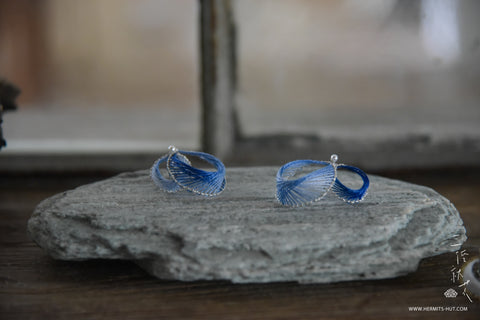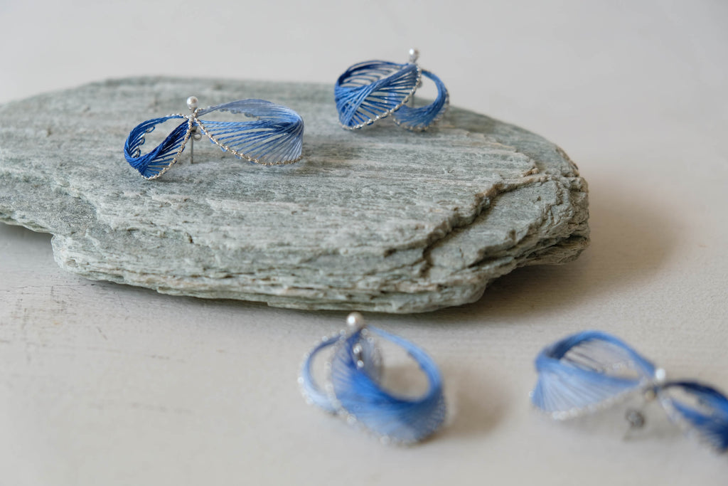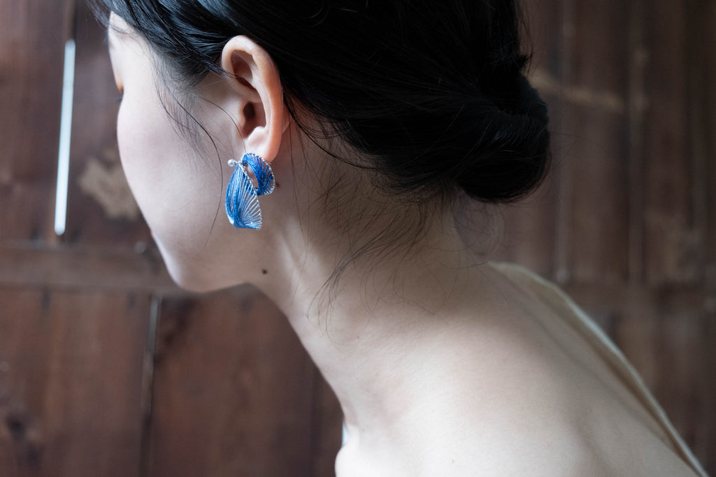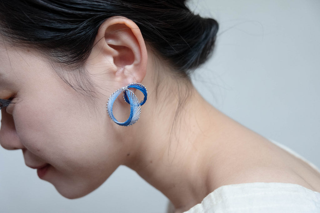 七星潭又名月牙灣,交織月牙狀彎彎繡片,將其雙雙捲起,藍白漸層繡線彷如一波波海浪,鑲在邊邊的白銀繡線是激起的白浪花,鑲上樹脂珍珠象徵日出。兩道波浪可自由調整方向配戴,就如海的變化萬千,在耳上也能有無限可能。