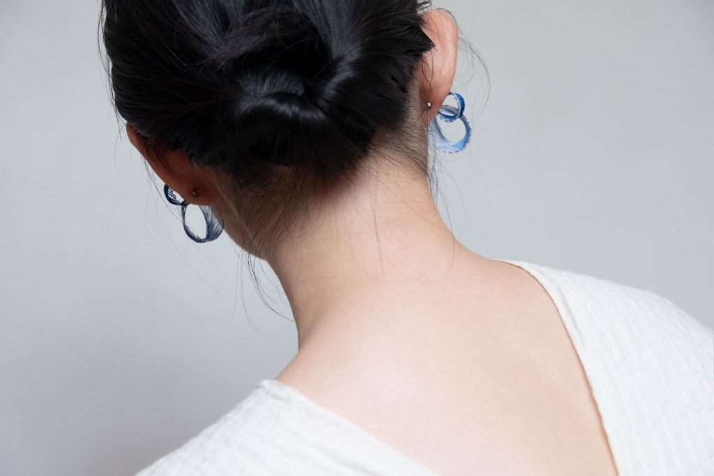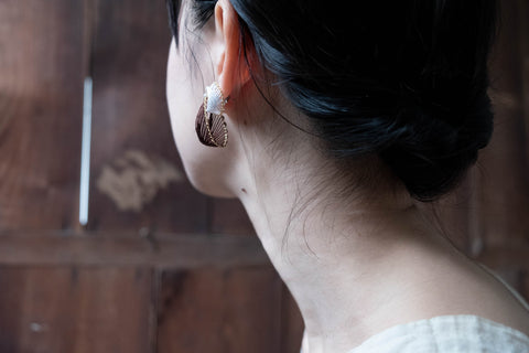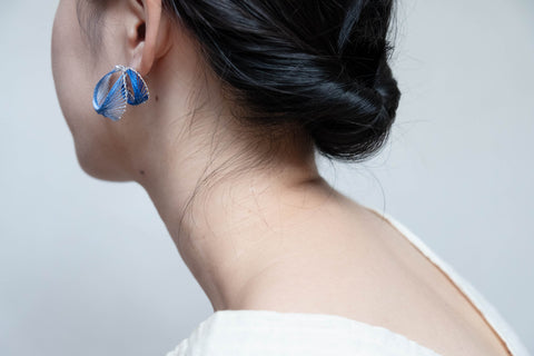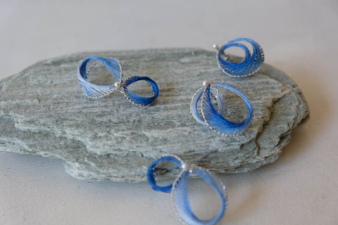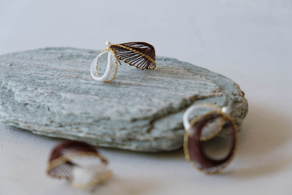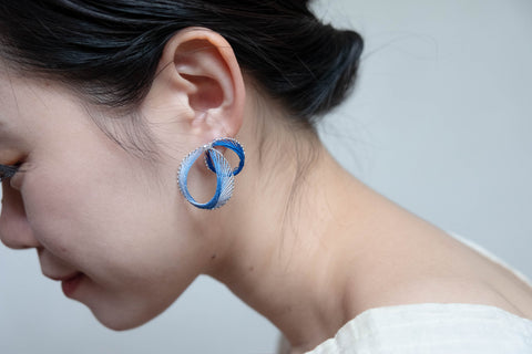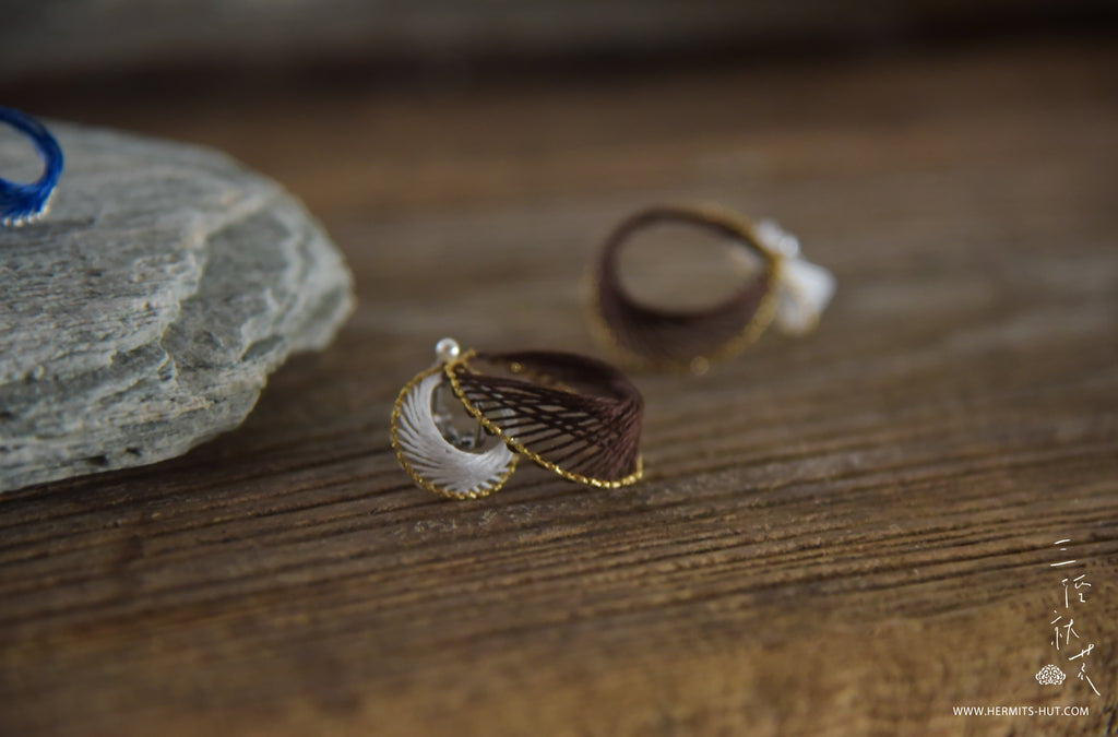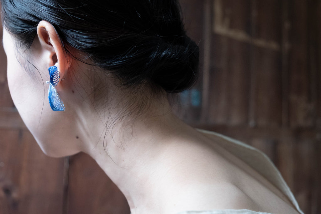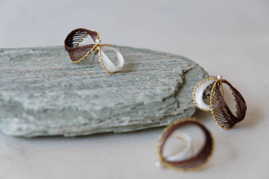 七星潭又名月牙灣,交織月牙狀彎彎繡片,將其雙雙捲起,藍白漸層繡線彷如一波波海浪,鑲在邊邊的白銀繡線是激起的白浪花,鑲上樹脂珍珠象徵日出。兩道波浪可自由調整方向配戴,就如海的變化萬千,在耳上也能有無限可能。